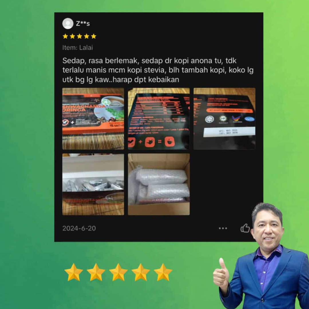 – Masukkan 1 sachet Kopi Ashwaganda Moringa ke dalam 200mL air panas/suam, kacau dan hidangkan